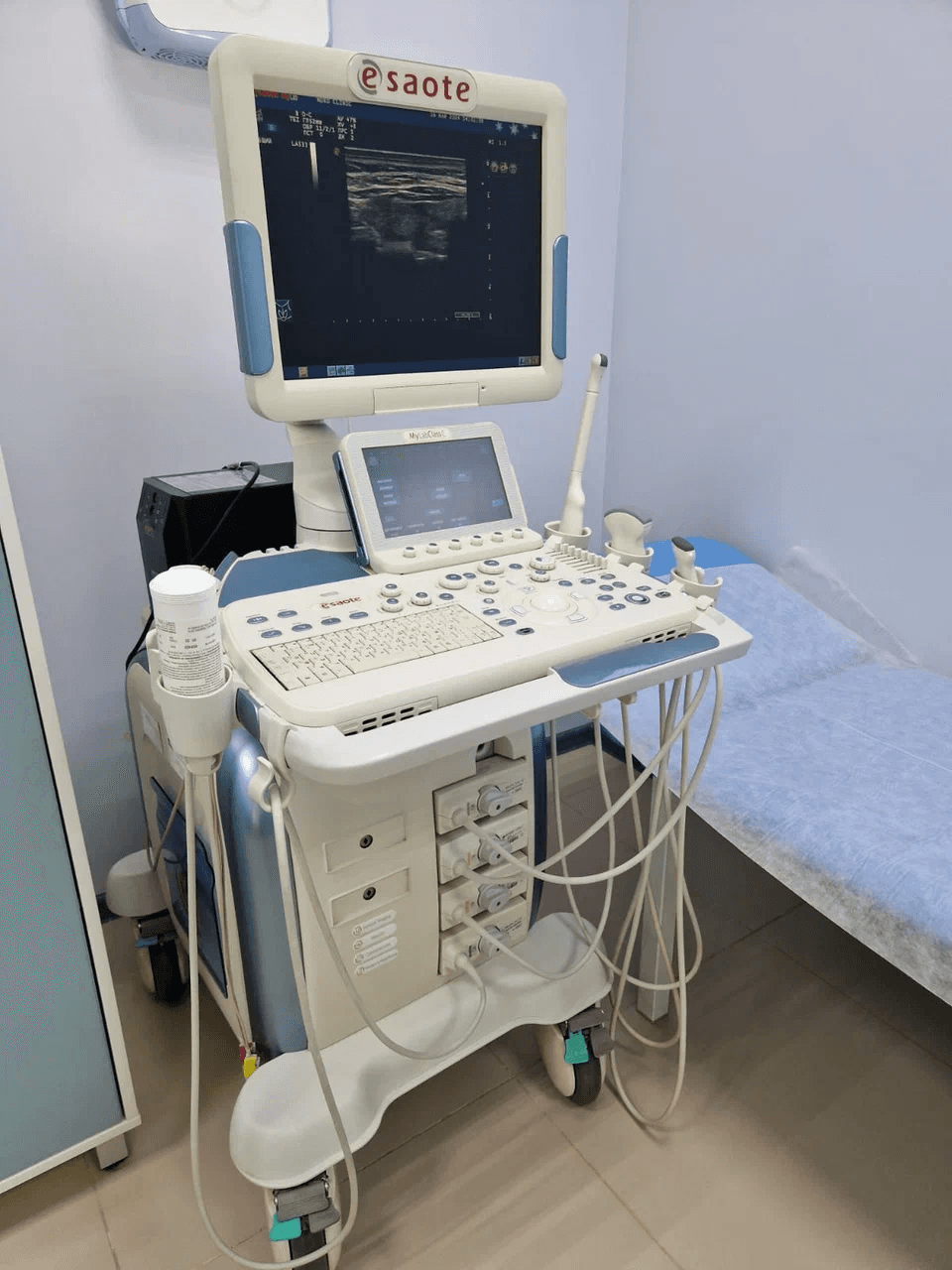 По мере развития клиники встал вопрос о необходимости приобретения мобильного аппарата УЗИ, т.к. многие наши манипуляции проводятся под УЗ-контролем. В 2013 году мы приобрели Esaote Му Lab One - идеальный, на наш взгляд, вариант для соноассистенции флебологических процедур. Аппарат легкий, мобильный, свободно перемещается между кабинетами, а наличие аккумуляторной батареи позволяет транспортировать его не прерывая исследование. Также преимуществом данного аппарата мы считаем сенсорный экран. Взаимодействие с интерфейсом возможно как рукой оператора, так и специальным стилусом, что позволяет использовать его в операционной с сохранением режима стерильности. Высокочастотный линейный датчик обеспечивает прекрасную визуализацию поверхностных структур, сравнимую по качеству с аппаратами более высокого класса.